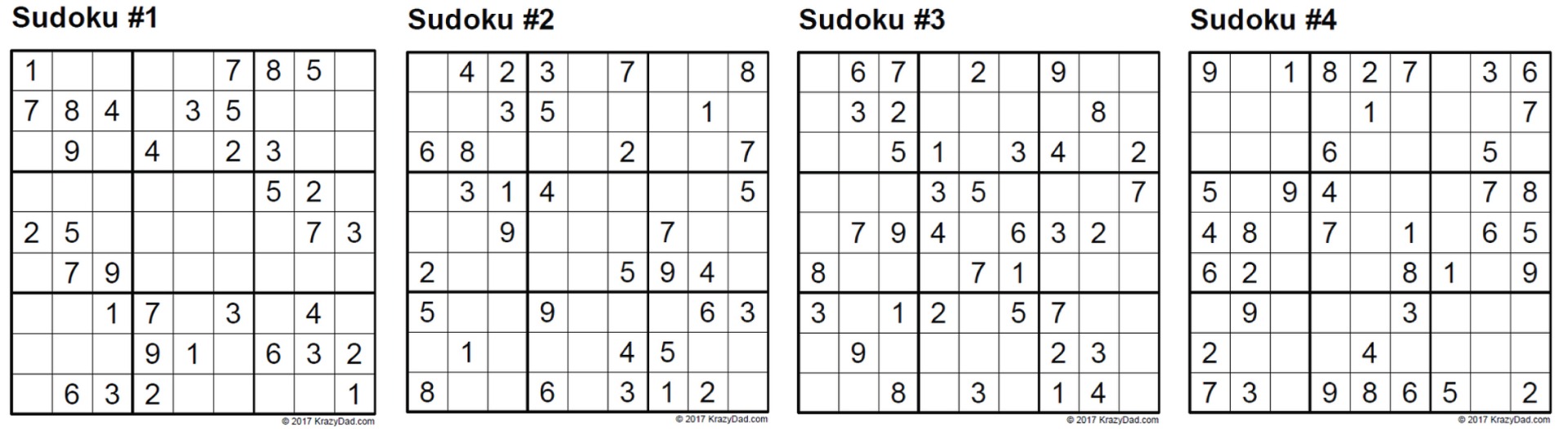 Toto jsou čtyři zadání sudoku, která jsou v KPZce. Úroveň je "snadná", zvládnete je vyluštit?